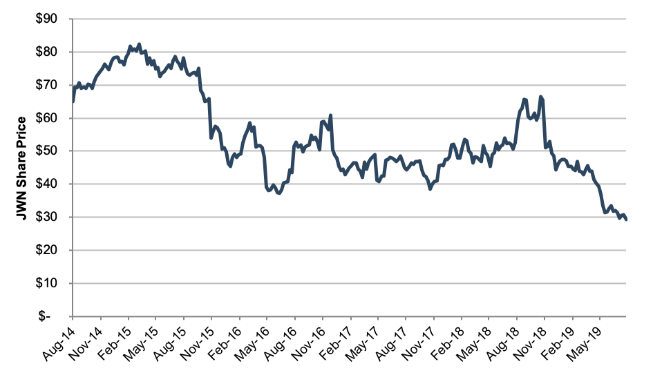 Some stocks are underpriced; others are cheap for a reason. Assuming the family’s proposal to increase its ownership stake goes forward, the independent directors will need to decide which is true of Nordstrom’s shares. Reported earnings for 1Q19 fell 55% from the prior year as total revenue slid by 3.5%. At Friday’s closing price, JWN shares imply a value of approximately 6.2x trailing EBITDA. Department store peer Macy’s (ticker: M), whose shares have also languished during 2019, trades at a comparable 6.5x multiple. As always, whether Nordstrom shares are undervalued or properly assessed by the market remains a matter of difficult judgment.