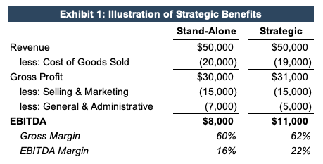 Exhibit 1 illustrates potential earnings enhancements available to a strategic buyer (in this case a competitor).