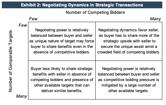 Does that mean that the target company is worth 38% more to the strategic buyer? Not necessarily. The amount that a strategic buyer will, in fact, pay for the target company depends on how many other strategic buyers they are likely bidding against and how unique the target company opportunity is.