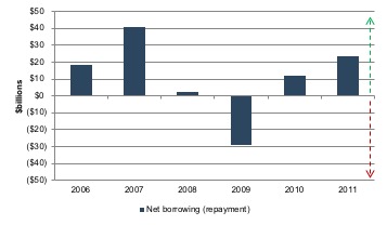 - Borrowers reduced debt levels. Whether by choice or by lender demand, companies repaid debt during 2009, in contrast to other years in which incremental borrowing is the norm. Exhibit 4 illustrates the net change in debt in each year over the period. After effectively eliminating incremental borrowing in 2008, the companies used $29 billion of available cash flow to pay back debt during 2009. For context, that represents about 83% of the $35 billion reduction in investment spending that year compared to 2008.