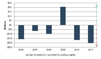 - Working capital really is a source of cash during a downturn. Cash management takes on extra importance during a recession. However, the data shows us that companies focused on working capital management can free up precious dollars by being intentional in inventory management and collections. As shown on Exhibit 2, the companies in our sample “found” $20.8 billion of cash by reducing working capital levels. For perspective, that’s nearly 12% of the total lost revenue of $175 billion during 2009.