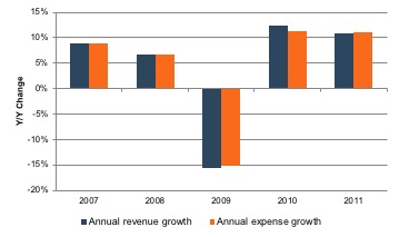 Exhibit 1 summarizes annual growth in revenue and expense for the years analyzed. In the face of a 15.6% drop in revenue during 2009, the companies in our sample trimmed expenses by 15.2%. As a result, EBITDA margin fell only modestly that year, from 12.0% in 2008 to 11.5% in 2009.