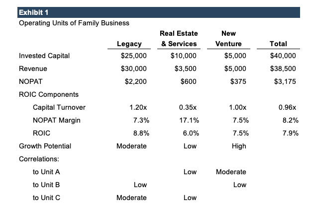 Risk is not linear.  When dealing with a portfolio of multiple assets, you must consider not just how risky each unit is in isolation, but how the units correlate with each other.  If the legacy business is having a great year, what does that mean for the new business and real estate segment?  When correlations between business units are high, there is not much diversification benefit to the shareholders.  In contrast, units with low correlations reduce the overall risk borne by the family shareholders.  As noted previously in Exhibit 1, the real estate unit has a low correlation with the legacy and new business units.  As a result, the real estate division reduces the riskiness of the overall business.  The “job” of the real estate unit is not necessarily to increase return, but to reduce risk.