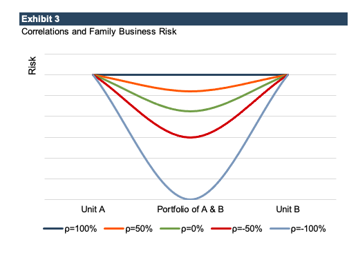 If Units A and B move in lockstep (i.e., have a correlation of 100%), combining them does not reduce the risk to the family.  However, as the correlation falls, so does the overall risk of the portfolio.  Correlation is a matter of degree; no family business units will be perfectly correlated (whether positively or negatively).  Family business directors should instead think about correlations on a relative basis.  How does the risk of each operating unit interact with the risk of the other operating units? This is important, because focusing on risk and return for operating units on a standalone basis will fail to consider adequately the overall impact of the units on the risks and returns of family shareholders.