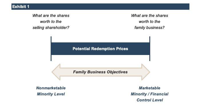 - However, in a shareholder redemption transaction, the buyer is not a hypothetical party, but the company that issued the shares in the first place. The family business is not burdened by the illiquidity of the shares in the same way a shareholder is. As a result, the value of the shares to the family business is consistent with the marketable minority level of value.