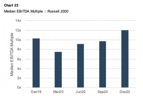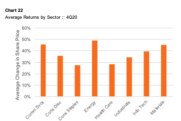 At the onset of the pandemic, the index fell precipitously. This is pretty easy to understand: investors don’t like risk, and risk was everywhere in the spring of 2020. During the second and third quarters, investors began to feel that they had a handle on the pandemic. In other words, investors grew increasingly comfortable that the long-term economic impact of the pandemic could be reasonably estimated. By the end of 3Q20, the index value had returned to pre-pandemic levels. When thinking about valuation, it is important to recall that the emphasis is always on the future. When the end of 3Q20 rolled around, it was clear that earnings for 2020 would be impaired because of the pandemic – so how could share prices be at the same level? Because the lower earnings for 2020 no longer mattered; the market was focused on earnings expectations for 2021 and beyond. Chart 21 shows that, while the market as whole had recovered by the end of 3Q20, not all companies did. Different industries fared differently. For example, healthcare shares increased sharply while energy shares were devastated. The storyline changes when we turn our attention to market performance in the fourth quarter of 2020. As shown on Chart 20, the index value surpassed pre-COVID levels by almost 20%. Chart 22 summarizes average share price changes by industry for the fourth quarter of 2020. In contrast to the share price performance during the first three quarters, the uplift in market prices during the fourth quarter was broad, with all sectors posting substantial average share price gains. Share prices change when earnings change and/or earnings multiples change. As shown in Chart 23, increasing earnings multiples played a significant role in the share price gains during the fourth quarter of 2020. Earnings multiples are defined by investor expectations for growth and returns.