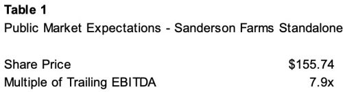 Since its shares are traded in the public markets, we know what Sanderson Farms was worth on a standalone basis. Prior to rumors of a potential transaction influencing trading, SAFM shares closed at $155.74 per share on June 18, 2021 (corresponding to 7.9x trailing EBITDA).