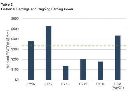 As is the case with many agribusiness companies, earnings for Sanderson Farms are cyclical, depending in large measure on various commodity markets. Table 2 relates the estimate of "ongoing" EBITDA noted above, to recent earnings (the green dotted line). So, what does the public market price of $155.74 "mean"? If investors paid that price, and the company continued to operate on a standalone basis while growing at 2.9%, those investors would earn an annualized return of 6.5% on their investment, which is consistent – on a risk-adjusted basis – with alternative investments available to them.