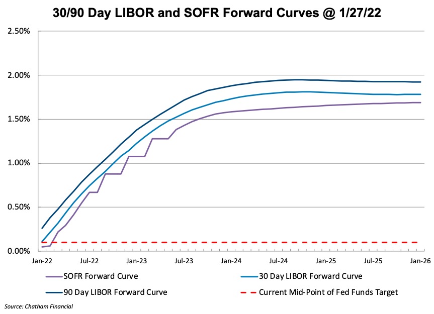 It is these short-term policy rates that are now poised to increase, which in turn impact short-term benchmark rates banks and other lenders use as a base rate to charge businesses, most notably 30-day and 90-day LIBOR and now the secured overnight funding rate (“SOFR”) for floating rate borrowings. (Note: LBIOR is in the process of being phased out and will be replaced by SOFR, AMERIBOR, and other less well-known overnight borrowing rates.)