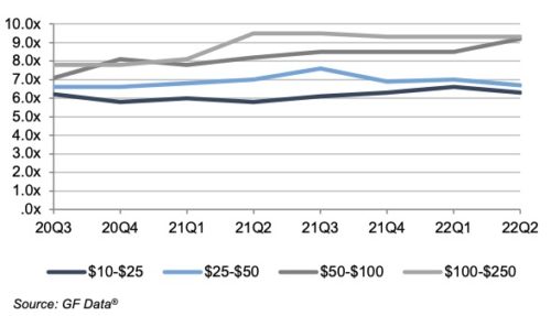 Yet despite these challenging macroeconomic conditions, deal activity did not come to a screeching halt in the first half of 2022, as seen in the middle of 2020. We believe this is a good sign for the overall health of the middle market, particularly when coupled with the fact that multiples on PE deals were relatively unchanged in the second quarter, as seen in the chart above. The prolonged “sellers’ market” of the past several years appears to be holding up to this point in 2022, as buyers continue to be willing to pay elevated multiples for well-positioned businesses coming to market. Deals in the $50-$100 million tranche of the middle market realized multiple expansions in the second quarter, growing from an average multiple of 8.5x to 9.2x. Multiples in other tranches were either unchanged or slightly down.