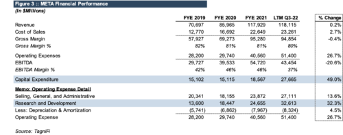 As shown in Figure 3, despite slowing revenues, Meta's capital expenditure increased nearly 50% from year-end 2021, and R&D expenses increased by over 32%. While the markets looked for belt-tightening, Mr. Zuckerberg went back for seconds.