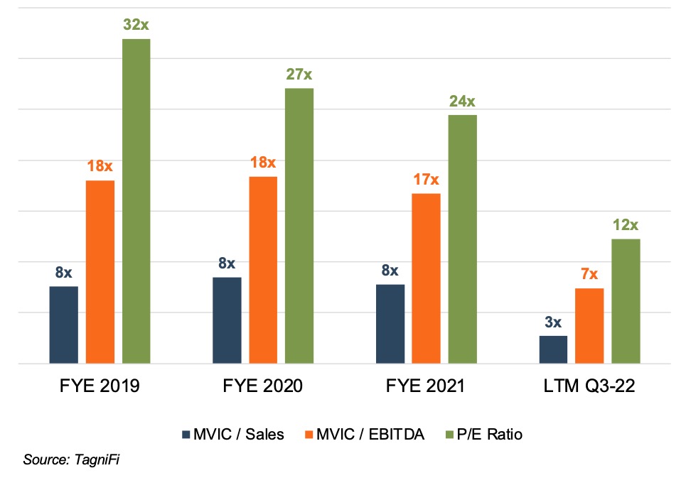 Meta Platforms (NASDAQ: META), formerly known as "Facebook," recently released its third-quarter earnings and guidance for 2023. Let's just say the market was less than pleased. Meta's stock fell over 20% in after-hours trading, which is down over 65% year-to-date. Per Figures 1 and 2, the stock is currently sitting at its lowest level since 2016, with a corresponding decline in implied valuation multiples.