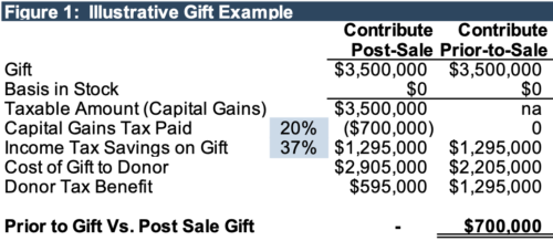To illustrate the benefits of this strategy, consider two alternative scenarios: (1) the business owner contributes to charity using funds after a sale of the business (“post-sale”), or (2) the business owner contributes stock to charity prior to the deal closing ("prior-to-sale"). We’ll briefly summarize Figure 1 below.