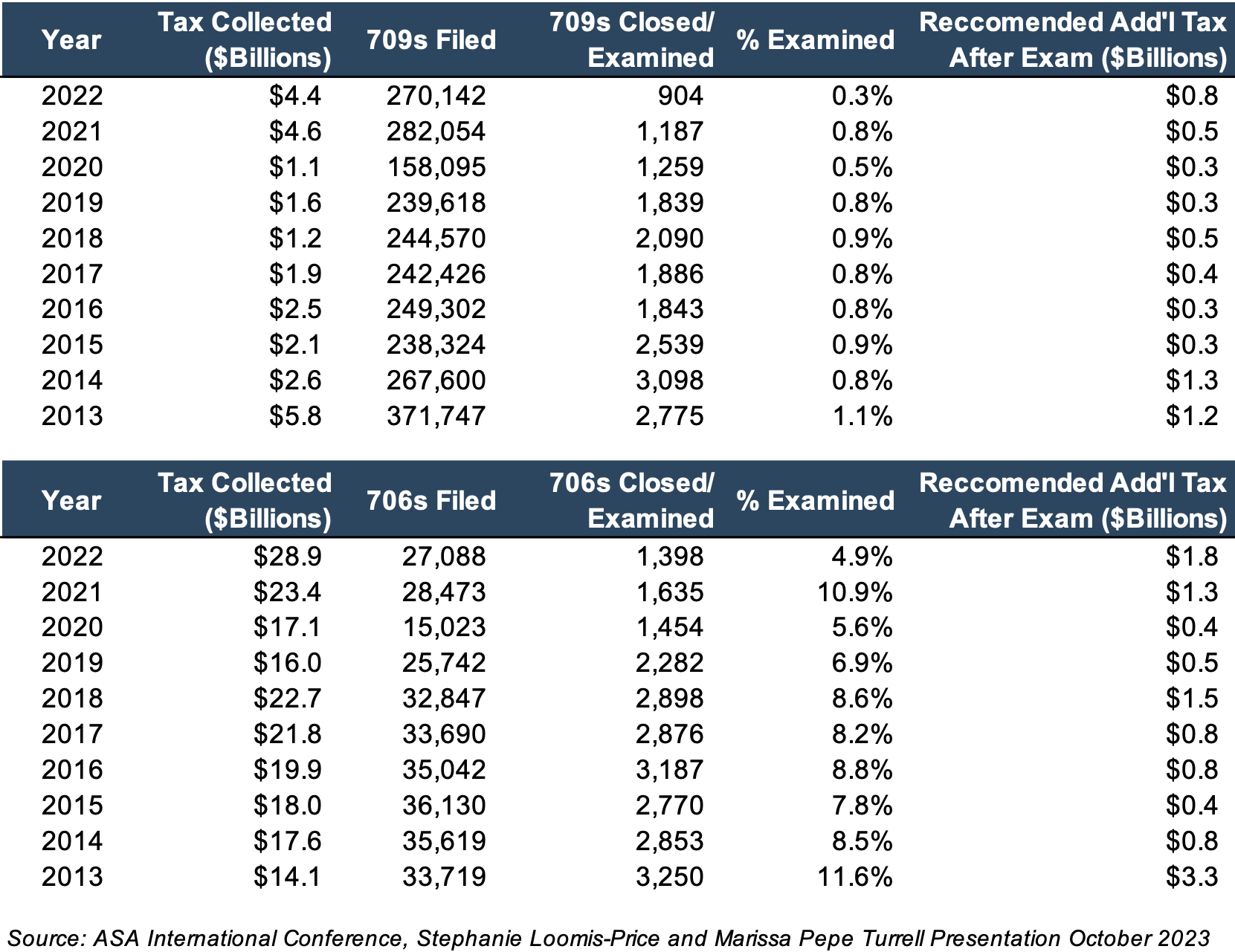 Noticing “money sent back to my bank account” didn’t make the list, one quickly notices “Enforcement” getting the largest dollar increase over the next ten years at nearly $46 billion. The IRS lists five objectives in its 2023 strategic operations plan. One of the objectives includes: “Focus expanded enforcement on taxpayers with complex tax filings and high-dollar noncompliance to address the tax gap.” Again, from the Tax Foundation: “Digging more into the specifics of enforcement, individual initiatives acknowledge some of the trade-offs in expanded enforcement operations. Within the third objective, dedicated to expanded enforcement, five of the seven initiatives involve expanded enforcement on certain types of taxpayers: large corporations, large partnerships, high-income and high-wealth individuals, other areas where IRS audit coverage has declined (including employment, excise, and estate and gift taxpayers), and developing areas such as digital assets.” A recent presentation by Stephanie Loomis-Price and Marissa Pepe Turrell at the ASA’s International Conference summarized 709 (gift) and 706 (estate) filings and audit rates, excerpted in Figure 2 below.