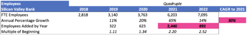 SVB hired 322 net new employees in 2019, 623 in 2020, and 2,440 in 2021. Imagine the internal resources necessary to identify and hire that many people. Given the numbers above, SVB hired 3,385 employees in three years and grew staff at a CAGR of 30%. For comparison, the entire banking industry's staffing grew at a 2% CAGR over the same period.