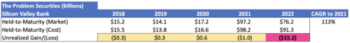 The offending securities in the figure above are called “held-to-maturity” and are treated so they can be carried on the balance sheet at cost. However, they do have market values, and those are shown above. The held-to-maturity securities had a cost basis totaling $91 billion compared to the market value of only $76 billion at year-end 2022.
