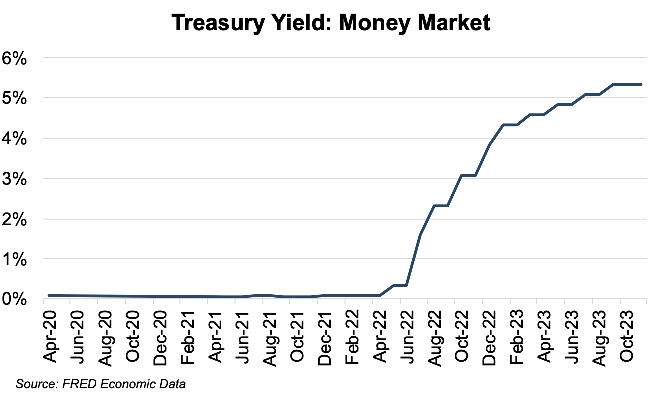 If you are like me, Thanksgiving has you feeling “full” both in terms of family time and your waistline. A recent Wall Street Journal article indicated investors and institutions are also full. Per the piece, institutions and investors have a record $5.7 trillion parked in cash-like money-market funds. The debate on Wall Street is whether investors are ready to gorge on a second helping of stocks, bonds, and other investments or if money market yields north of 5% have everyone ready to put their dishes away and take an afternoon nap. Figure 1 highlights money market yields over the last several years.