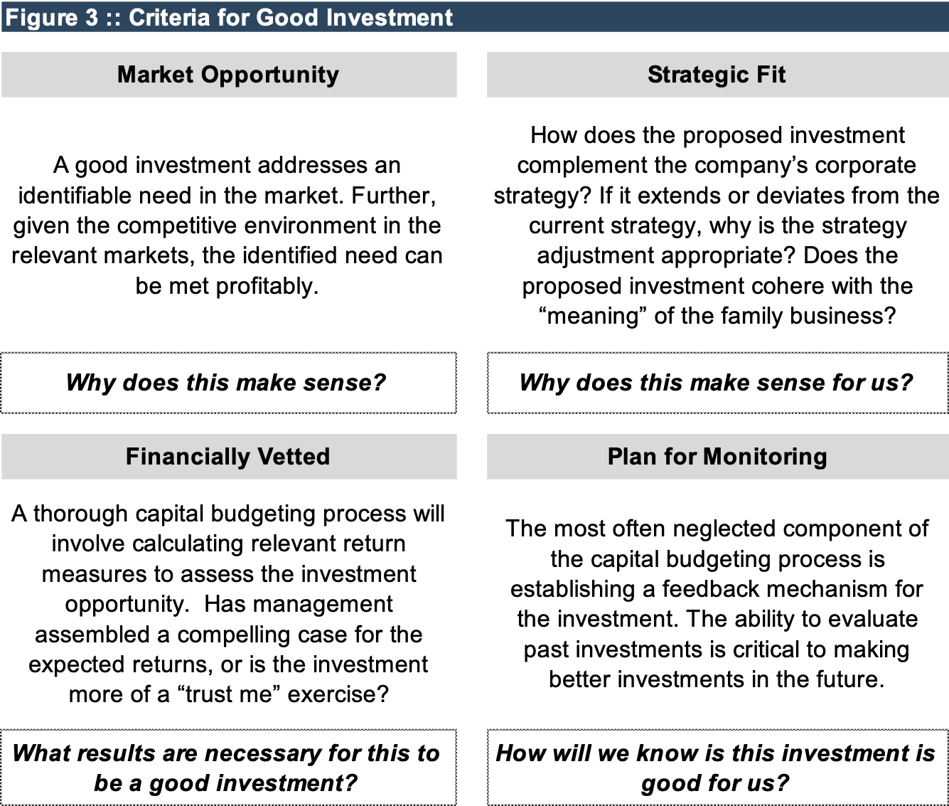 However, family businesses have limited financial resources, and you may face multiple options that exceed your company’s hurdle rate or WACC. What then? We see family businesses make good investments by focusing on four areas: market opportunity, strategic fit, financial vetting, and success monitoring. We detail these areas in Figure 3 below.