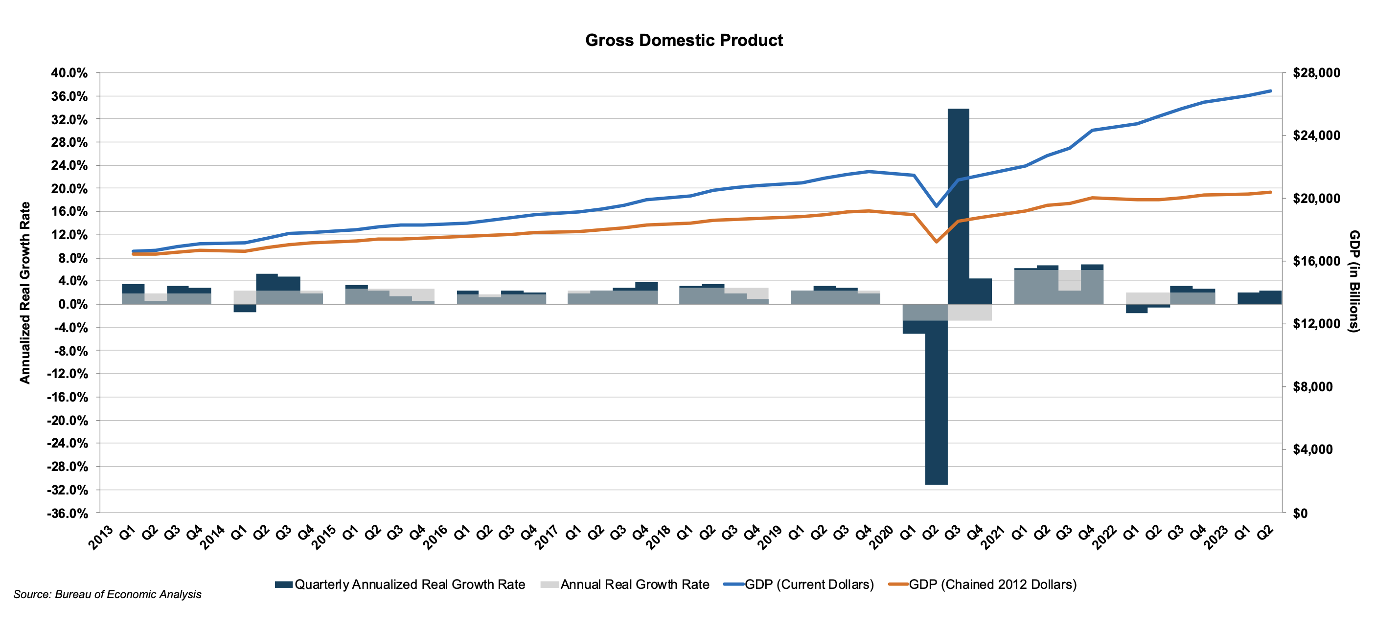 According to advance estimates released by the Bureau of Economic Analysis, GDP increased at an annualized rate of 2.4% during the second quarter, which follows an increase of 2.0% in the first quarter.
