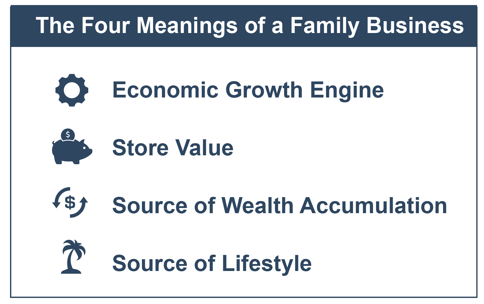 Something to ask (and re-ask) yourself often: what does the business mean to us? Over time, we have observed that families tend to assign one of four basic meanings to their family business: