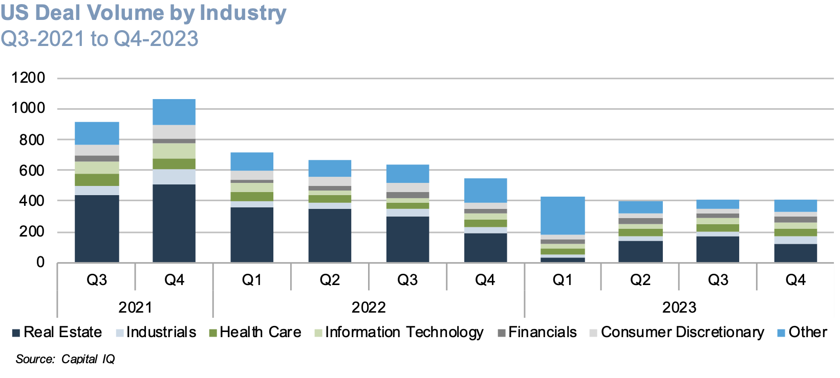 As shown in the chart below, overall U.S. deal activity, as compiled by Capital IQ in the fourth quarter, was little changed from the depressed levels observed in the first three quarters of 2023. Pitchbook reports that U.S. PE middle-market activity, defined as deals with an enterprise value of less than $1 billion, bounced back for the second time in the last eight quarters in the fourth quarter of 2023, suggesting that the depressed levels realized in the second and third quarters of 2023 could represent the trough in the current middle market M&A cycle.