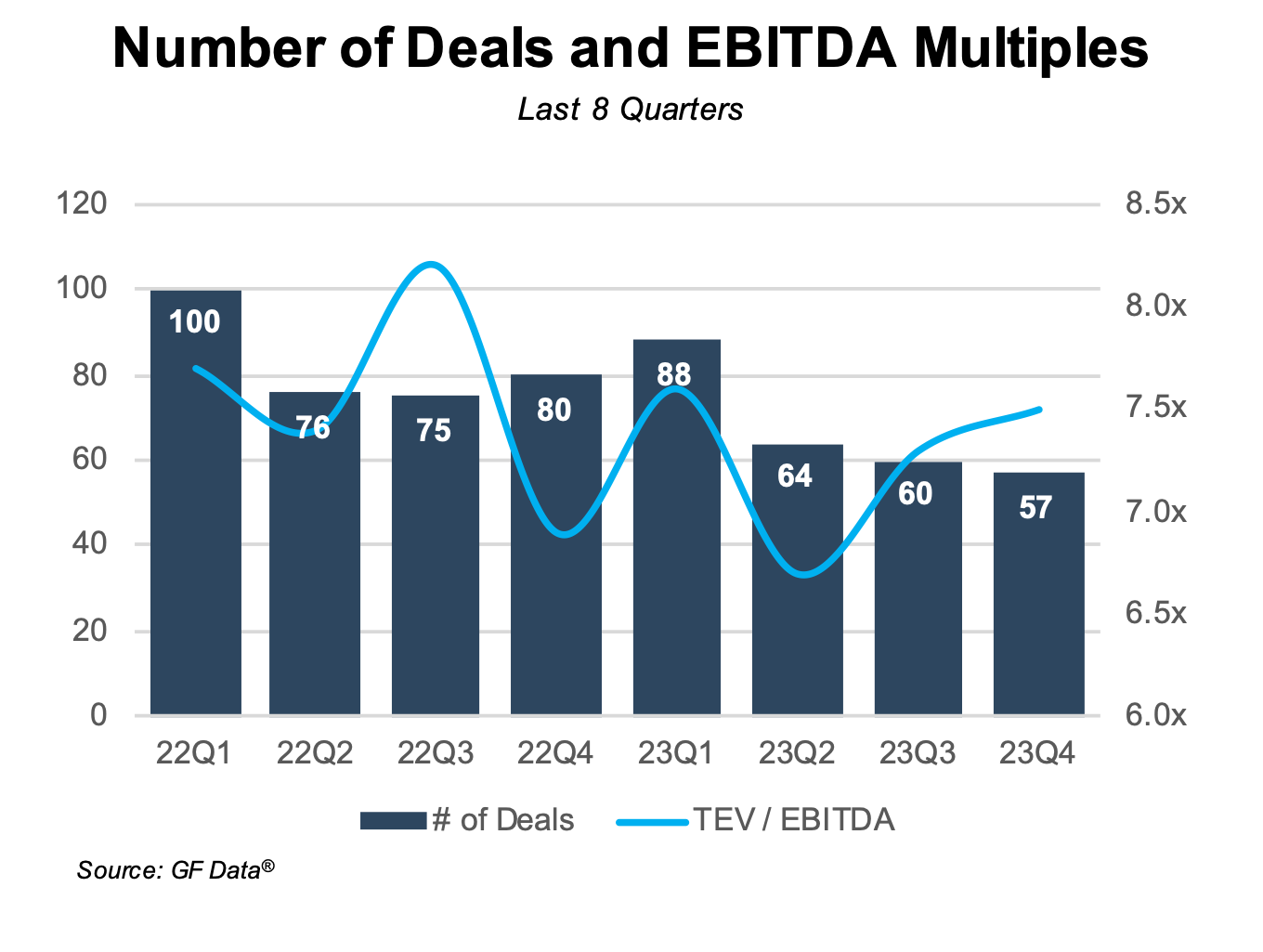 Although middle market transaction activity remained depressed in the fourth quarter of 2023 compared to 2022, M&A activity and multiples improved a bit compared to recent quarters. Possible Fed rate cuts, a resilient economy despite 525bps of Fed rate hikes, and ample dry powder held by PE firms to deploy may be the catalysts for a stronger rebound in 2024.