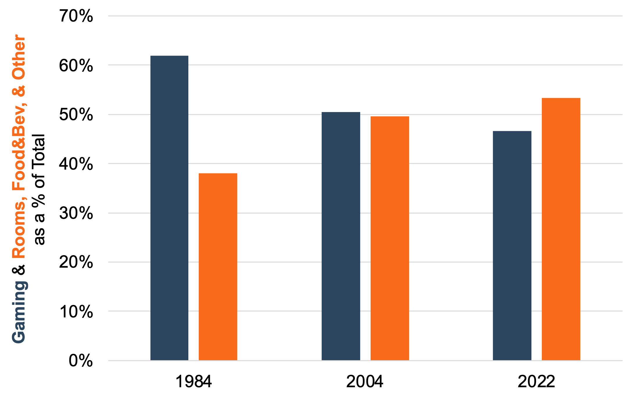 Total casino resort revenue increased from $4.7 billion in 1984 to nearly $30.0 billion in 2022, with fresh records for casino and gaming revenue set in 2023. Over that time, per data from the UNLV Center for Gaming Research, the revenue pattern of the industry has shifted as gaming itself has become less important to the overall revenue picture. Figure 1 below highlights the shift in total gaming department revenues for Nevada from 1984 through 2022, with gaming seeing relative declines to other revenue sources.