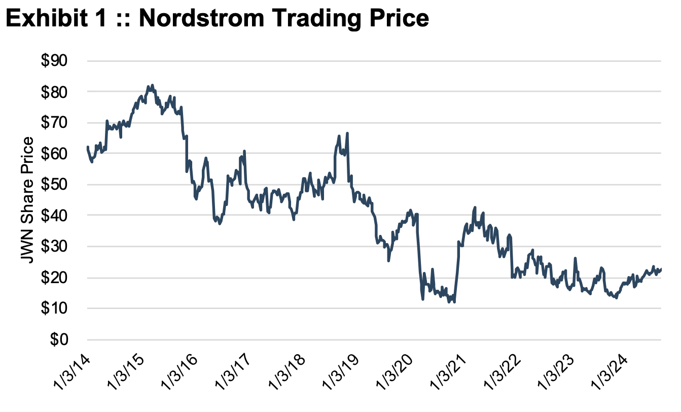 Nordstrom was in the news again this week, with the company disclosing that — once again — members of the Nordstrom family were offering to take the company private, this time for $23 per share. As of the writing of this post, the Nordstrom board had formed an independent committee to evaluate the offer. The $23 per share offer compares to an average trading price for Nordstrom shares of approximately $22 per share during August 2024. Prior to the reporting of a potential buyout offer in April 2024, the shares were trading in the neighborhood of $18 per share. It’s certainly not our place to second guess the Nordstrom board, but in hindsight, JWN shareholders undoubtedly regret the refusal of the $50 offer in March 2018 and the (unspecified) purchase offer in the fall of 2019. Exhibit 1 depicts Nordstrom's share prices since 2014.