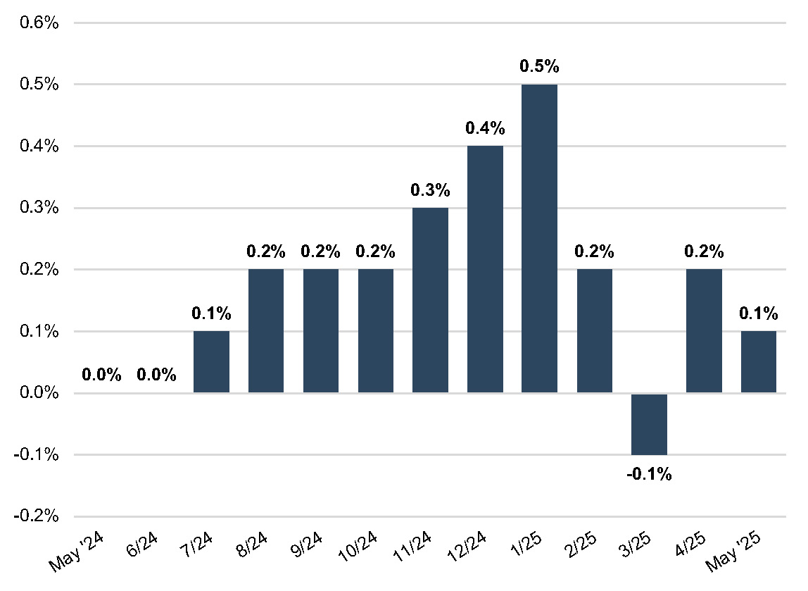 May inflation readings came in well below forecasts, with monthly CPI increasing 0.1% from April (a decrease from the April monthly reading) and annual CPI increasing 2.4% through the twelve months ended May 2025.  Prices for new cars and clothing, which are highly tariff-sensitive consumer goods, actually fell marginally in May.  Prices for other consumer goods, such as appliances, car parts, and audio equipment, did see increases in May, which could be early indicators of tariff-induced inflation. If inflation readings continue on their current trajectory, the Fed could potentially have a case to resume cutting rates later this year, particularly when coupled with recent signs of cooling in labor markets.  Job growth slowed in May, and the unemployment rate remained at 4.2% despite widespread cuts to federal government jobs and spending.  With the Fed set to meet on June 17th and 18th, favorable inflation readings and stagnating employment data will certainly be top of mind for FOMC officials.  The Fed is widely expected to hold rates steady, as it has through all of 2025 to this point.  Rather than wondering if there will be a rate cut at the June meeting, Fed observers will be keenly awaiting the Fed’s newest set of economic and rate cut projections following the June meeting, which should provide clues as to how FOMC members view the latest inflation and employment releases.