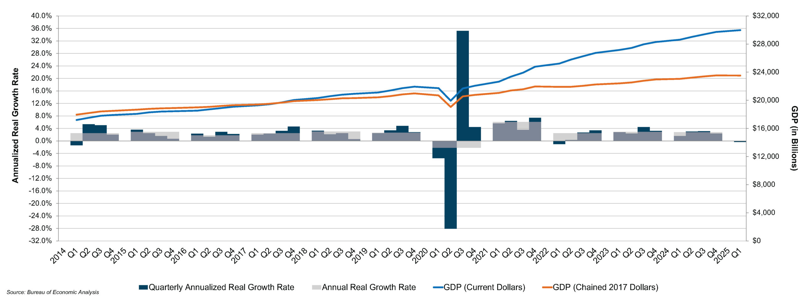 According to advance estimates released by the Bureau of Economic Analysis, GDP decreased at an annualized rate of 0.2% during the first quarter of 2025, which follows an increase of 2.4% in the fourth quarter of 2024.  Consumer spending, representing roughly 70% of total economic activity, increased only marginally (0.8%), contributing to the overall contraction in GDP.  Consumer spending on durable goods fell 0.3% in the first quarter while spending on services increased 0.8%.
