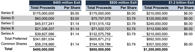 Even under the relatively disappointing $400 million exit scenario, the Scenario E shareholders are entitled to return of their investment, or $5.00 per share, while the proceeds to more subordinate classes range from $1.14 per share to $3.00 per share. The following chart depicts the superiority of the proceeds for Series E preferred shares to Series A shares over enterprise exit values less than $1.0 billion:
