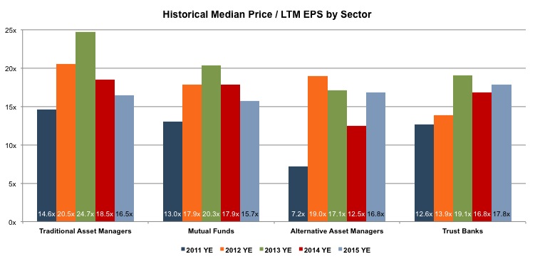 A quick look at year-end pricing of publicly traded asset managers reveals a continued skid in multiples for traditional RIAs and mutual funds with modest advancement for the alternative managers and trust banks.