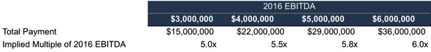 Fortunately for Tri-State, the bank elected to structure the deal as an earn-out whereby roughly half of the total potential consideration was guaranteed and the remaining half had to be “earned” by meeting certain earnings objectives following deal closure. The downward revision implies that the business is not likely to generate more than $3 million in EBITDA this year, and an ~11x purchase for a closely held RIA with compliance issues and a declining AUM balance (ADV disclosures indicate that Killen’s AUM fell 27% in 2015) would have been hard to justify had the total deal value been paid up front. Instead, Tri-State is still likely to boast a decent ROI on this deal without paying another dime for it if the business fails to perform in line with initial expectations. The following table shows the implied total deal value under four different scenarios of EBITDA for this year.