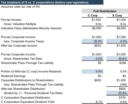 The new tax legislation has a big impact on C corporation taxes, a more modest impact on personal income taxes, and no effect on capital gains taxes. As a consequence, the economic advantage of organizing as an S corporation or LLC has been whittled away to almost nothing in some cases, and is arguably disadvantageous in other cases.