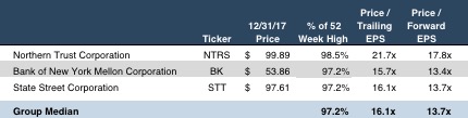 Despite the relative underperformance during 2017, trust banks saw increases in their two largest sources of fee revenue (servicing and investment management fees) due primarily to strengthening equity markets. Trust banks also saw improved net interest margins due to higher U.S. market interest rates. Trading services revenues, which are a less significant component of fee revenue than servicing and management fees, were generally down in 2017 due to low volatility in the equity markets. Trust bank trailing multiples have expanded in line with other categories of asset managers since last year, so their underperformance suggests that earnings haven’t kept pace.