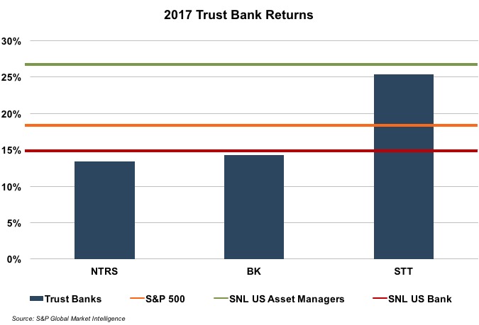 Throughout 2017, trust banks tended to underperform other classes of asset managers like alternative asset managers, mutual funds, and traditional asset managers. To put this in historical context, trust banks have lagged the broader indices since the financial crisis of 2008 and 2009, although in 2016 our trust bank index was the highest performing category of asset manager. With the exception of trust banks, all classes of asset managers outperformed the S&P 500, as rising equity markets and operating leverage combined to increase the profitability of these businesses.