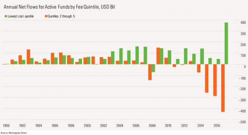 The return of market volatility and the reintroduction to the idea that markets can, in fact, go down, have brought back into focus the industry headwinds which, at least for the last several years, have been allayed by a favorable market backdrop. Notably, outflows from higher cost funds have continued to increase, as shown in the following chart from Morningstar. During 2017, the chart shows accelerating outflows from the most expensive active funds and record inflows into the cheapest ones. These dynamics are problematic for many mutual fund companies and other asset managers that rely on active equity products, which are necessarily more expensive to implement than their passive counterparts.