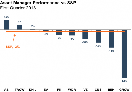 Publicly traded asset managers had a rough first quarter, as volatility returned to the market and major indices posted negative quarterly returns for the first time in over two years. While the overall drop in the market was relatively modest, stock price declines of publicly traded asset managers were generally more significant. It is not surprising that most asset managers have underperformed during periods of declining markets, since the reverse was true during 2017, when most asset managers outperformed the major indices. To the extent top-line volatility is tied to AUM movements and costs are fixed, market swings will have a magnified impact on earnings (and stock prices) for asset managers.