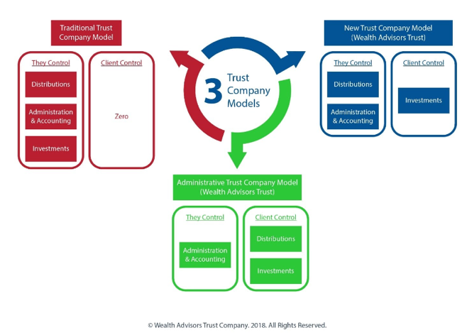 As depicted in the illustration below published by Wealth Advisors Trust Company, trust companies have traditionally managed the distribution, administration, and investment of trust assets. However, more trust companies are shifting to a directed trustee model, which allows an investment advisor to be named on the account so that investment decisions are made by the appointed advisor rather than the trust company. This allows the trust company to focus on fiduciary issues related to trust and estate administration rather than investment management.