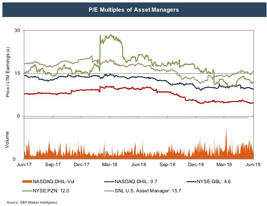 As most value and growth managers’ clients are primarily (performance chasing) institutional investors, this recent disparity has been particularly challenging for value investment firms looking to grow (or even maintain) their AUM balances. The market has clearly picked up on these issues, especially over the last couple of years – two out of the three public (and predominantly) value-oriented investment firms (Gabelli and Diamond Hill) are in bear market territory while the S&P is up nearly 20% since the Summer of 2017:
