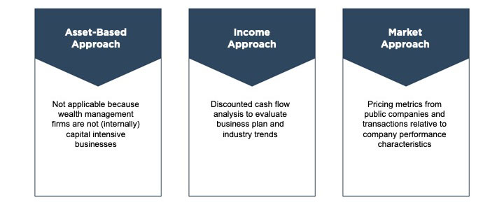 There are three general approaches to determining the value of a business: the asset-based approach, the income approach, and the market approach. The three approaches refer to different bases upon which value may be measured, each of which may be relevant to determining the final value. Ultimately, the concluded valuation will reflect consideration of one or more of these approaches (and perhaps several underlying methods) based on those most indicative of value for the subject interest. The chart below summarizes the methods typically used to value wealth management firms under each valuation approach.