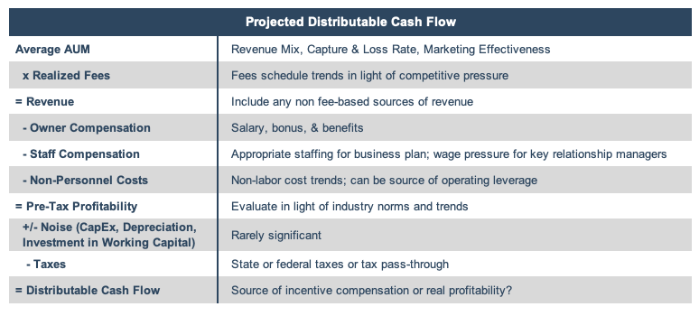 The base rate of profitability is determined by a wealth manager’s current revenue and cost structure, with possible adjustments made. It is often said that wealth managers generate revenue while they sleep, as revenue is a function of assets under management and is typically not performance or commission based. The fee-based revenue model used by most wealth management firms allows us to determine an ongoing (run rate) level of revenue by multiplying assets under management at any given day by the business’ average realized fee structure.