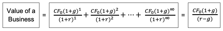 The denominator of the expression on the right (r – g) is referred to as the “capitalization rate,” and its reciprocal is the familiar “multiple” that is applicable to next year’s cash flow. The multiple (and thus the firm’s value) is negatively correlated to risk and positively correlated to expected growth.
