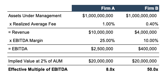Both Firm A and Firm B have the same AUM. However, Firm A has a higher realized fee than Firm B (100 bps vs 40 bps) and also operates more efficiently (25% EBITDA margin vs 10% EBITDA margin). The result is that Firm A generates $2.5 million in EBITDA versus Firm B’s $400 thousand despite both firms having the same AUM. The “2% of AUM” rule of thumb implies an EBITDA multiple of 8.0x for Firm A—a multiple that may or may not be reasonable for Firm A given current market conditions and Firm A’s risk and growth profile, but which is nevertheless within the historical range of what might be considered reasonable. The same “2% of AUM” rule of thumb applied to Firm B implies an EBITDA multiple of 50.0x—a multiple which is unlikely to be considered reasonable in any market conditions.