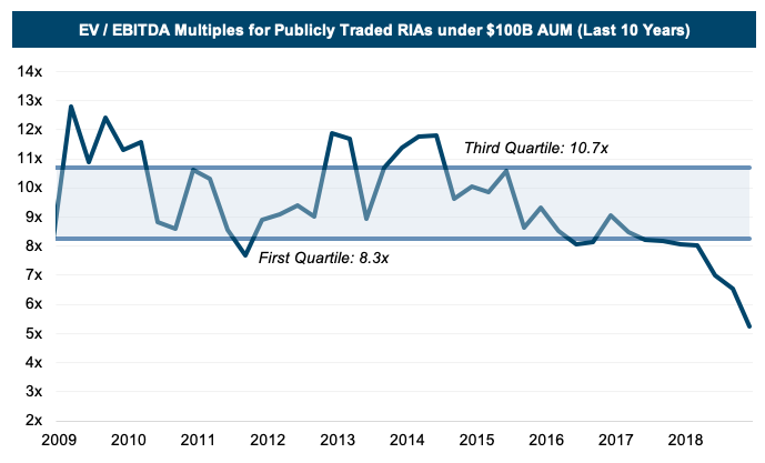 The chart below shows historical EV / LTM EBITDA multiples for publicly traded RIAs with less than $100 billion in AUM (the size range which most of our clients fall in). As can be seen, the public companies have generally traded in a band of 8-11x LTM EBITDA, although the pricing at the end of 2018 had fallen to a historically low multiple of just over 5 times, partly due to increased market volatility observed at year-end.