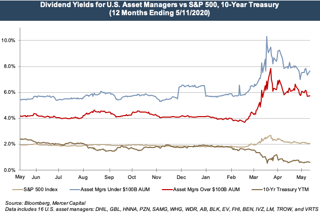 Are we really in a yield-starved environment?  One would think so, with longer dated Treasuries priced more on the basis of a return OF capital than return ON capital.  The broader market has shrugged off the likelihood of steep declines in earnings, leaving the dividend yield on the S&P 500 mostly unchanged from what it was before the advent of COVID-19.  RIA pricing, ironically, has not enjoyed the same support.
