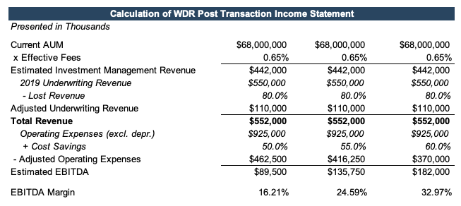 With AUM of approximately $68 billion and pro forma effective fees of around 65 bps, the post-transaction business will likely generate about $450 million of investment income. A little under 90% of WDR’s underwriting revenue was generated through its advisor network. Post-transaction, Macquarie will be one of LPL’s top strategic asset management partners, which suggests that Macquarie will not lose all revenue associated with its advisor network. As such, we have estimated WDR’s underwriting revenue stream could fall by approximately 80%. There will be expense savings generated by selling this business and additional synergies from merging with Macquarie. However, buyers don’t often pay for something they bring to the table, so WDR was likely only compensated for the cost reductions associated with selling its wealth management business. Thus, we have modeled a range of scenarios with between 50% to 60% cost savings.