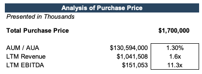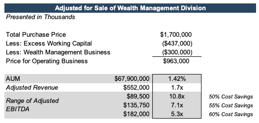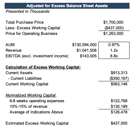WDR has historically held lots of cash and investments on its balance sheet, for which Macquarie likely paid dollar for dollar. Typically, RIAs hold between 6-8 weeks of operating expenses on its balance sheet as working capital, or approximately 10% to 15% of revenue. With an estimated $437 million of excess working capital on its balance sheet, the price for the operating business is approximately $1.26 billion, which implies multiples more in line with the typical range observed in the legacy asset management space.