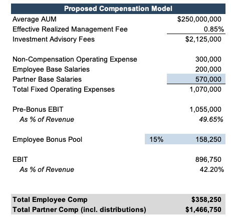 Tying a new hires’ compensation to firm profitability is usually good practice but may be too costly if the shareholders aren’t paying themselves a salary and bonus. In the proposed model above, the partners increase their base salary to better align company profits with industry norms.