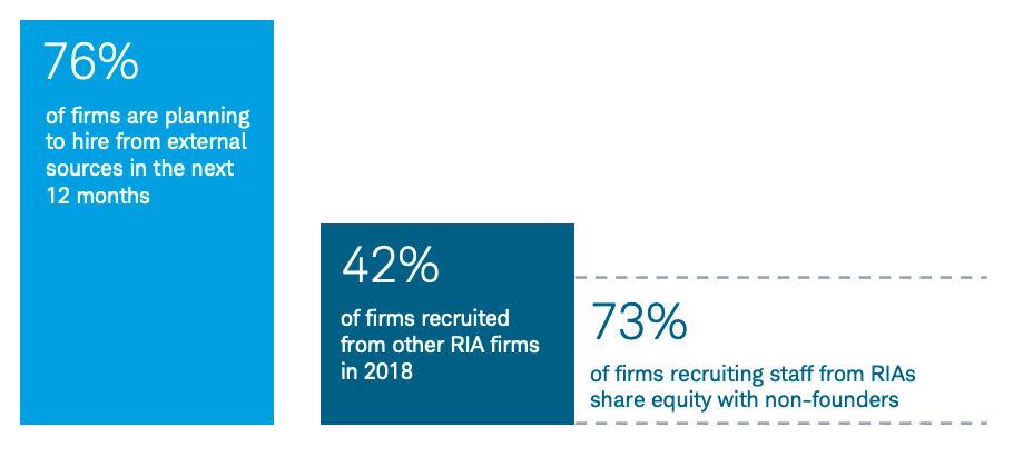 The study reported that 76% of RIAs are planning to hire in the next twelve months, and 42% of firms recruited from other RIAs in the last year. The report also noted that 73% of these acquiring firms share equity with non-founders, suggesting that stock incentives are also part of the overall compensation package for the senior management group.